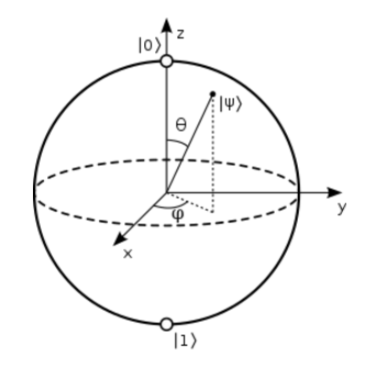 La imagen muestra la esfera de Bloch, una representación gráfica de los estados posibles de un qubit. Este modelo ayuda a visualizar la superposición y la manipulación de qubits como rotaciones en un espacio tridimensional.