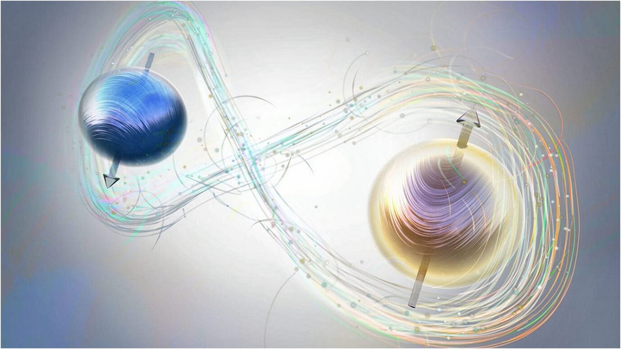 La imagen representa dos qubits entrelazados, conectados por una especie de lazo de información invisible. Es un fenómeno fascinante que Albert Einstein llamó "spooky action at a distance".