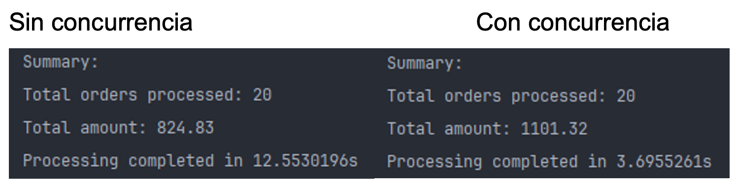 A continuación, se muestra un ejemplo de un programa que procesa 20 órdenes aleatorias, sumando el total de cada orden con el siguiente. En un programa sin concurrencia, el procesamiento de las 20 órdenes tarda 12.55 segundos. En contraste, el programa que utiliza concurrencia con cinco trabajadores (goroutines) completa el procesamiento en sólo 3.6 segundos.